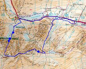 Here is the route that I joined on the first day. It is marked by a blue line; we were going anticlockwise; grid lines are drawn at 1 km distance. The round blobs on the route (in this case four) denote the places where the photos were taken. |